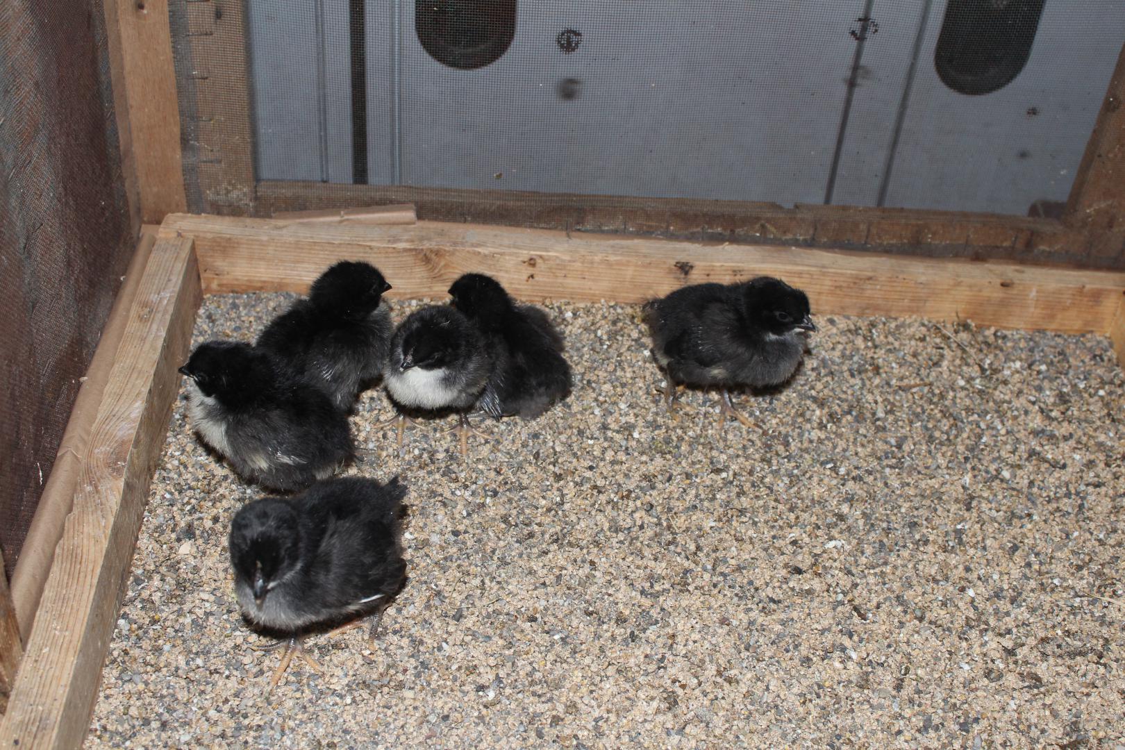 Flauschig: die Küken der Augsburger HühnerVon den schwarzen Augsburger Hühnern mit dem roten Kamm kamen 16 Eier in den Brutkasten, damit rechtzeitig zur Eröffnung Küken herumwuseln. Damit sie nicht den Greifvögeln oder der fürsorglichen Fuchsmutter zum Opfer fallen, wurde vorsorglich ein Netz über dem Hühnergehege angebracht und mögliche Zugänge verbarrikadiert.